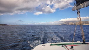 V 17.25 na dohled od Messiny jsme pluli v protiproudu 5.8 uzlu a pozorovali zajímavou hru mísících se proudů a vírů. Přistání...